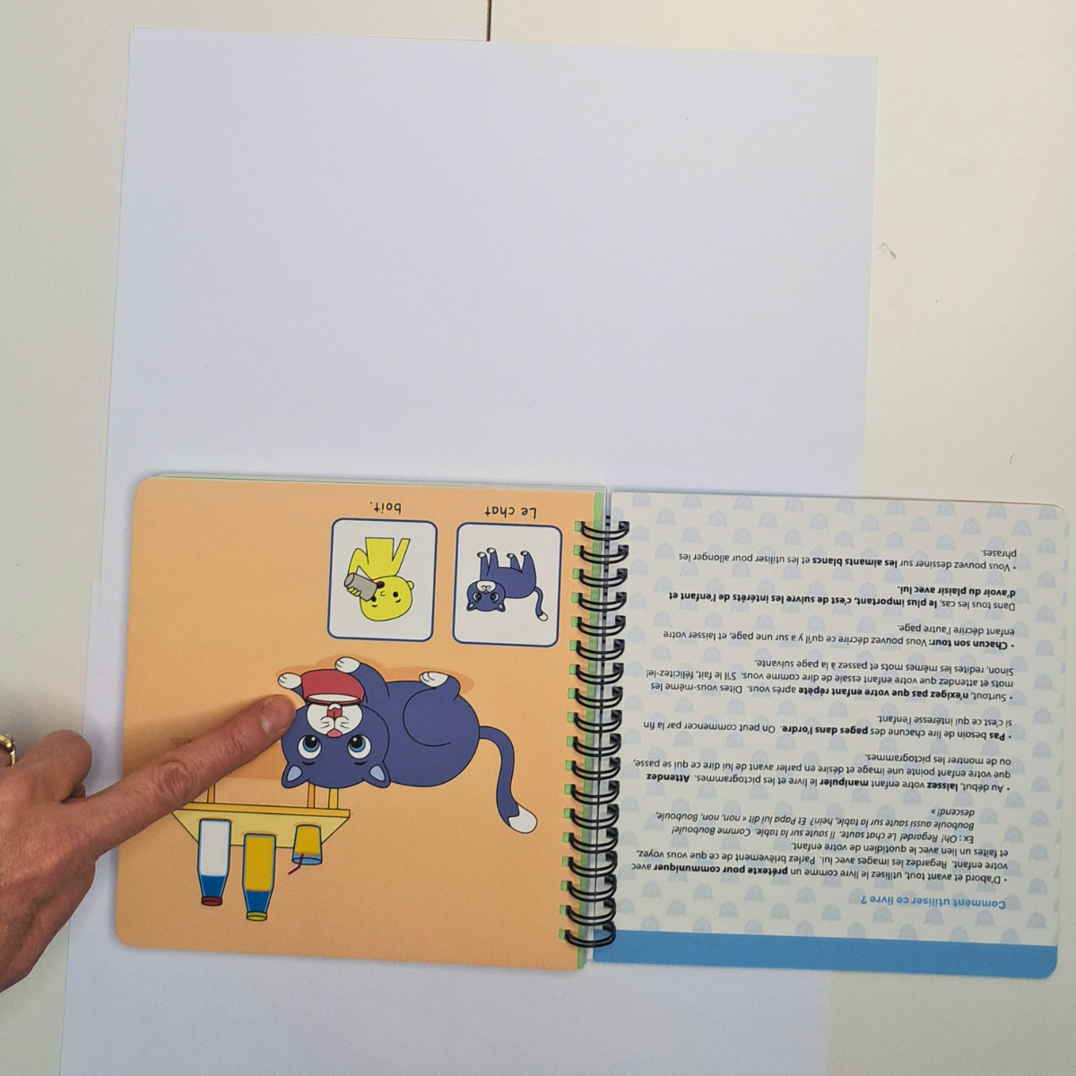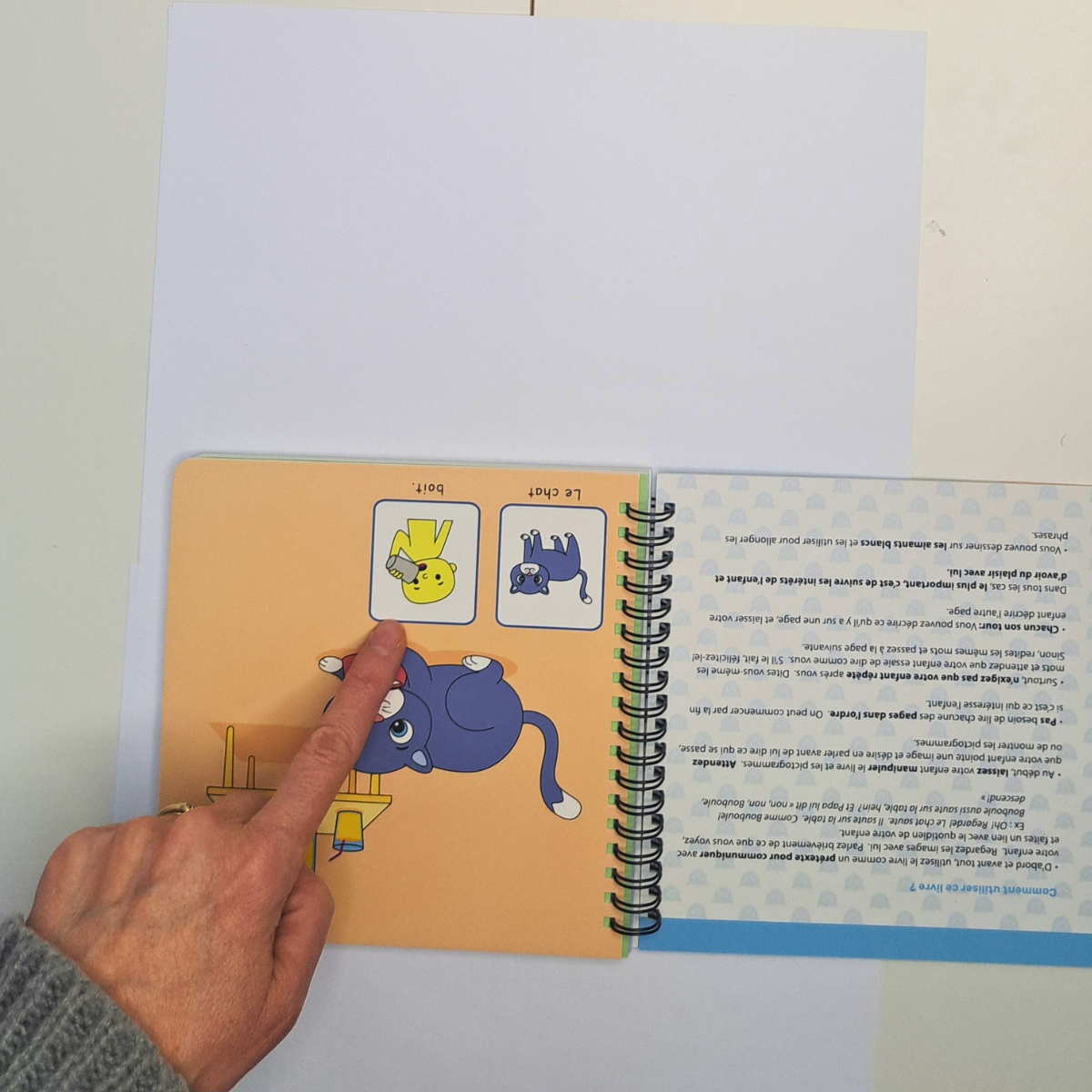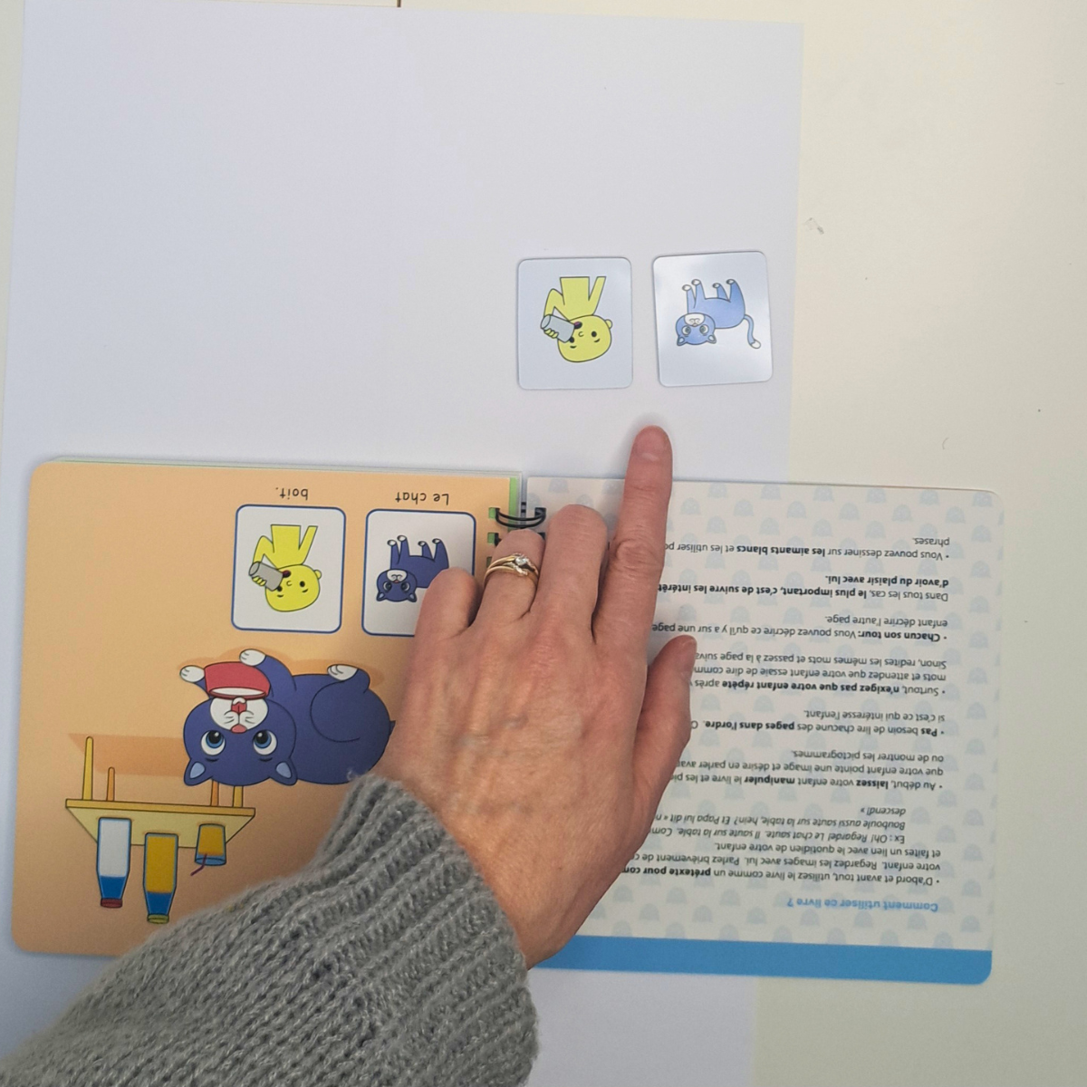 Après une ou deux pages, quelque chose s'est produit. Ce n'est pas vraiment un miracle — c'est l'efficacité combinée d'une bonne intervention et d'un matériel bien adapté. M. a saisi elle-même un aimant, l'a placé sur la page, et a dit : « Le chat… joue ! » — en enchaînant aussitôt avec le mime.